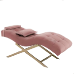 La Camilla Lashista Fara combina delicadeza y funcionalidad. Tapizada en terciopelo rosa palo con patas doradas, destaca por su diseño femenino y elegante. Proporciona comodidad superior tanto para clientes como para especialistas.