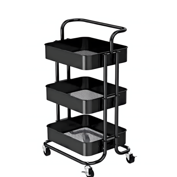 El Carrito Auxiliar Ela es la solución ideal para mantener el orden en barberías, salones de belleza o centros estéticos. Con estructura metálica resistente y bandejas plásticas negras, ofrece gran capacidad de organización sin ocupar mucho espacio. Sus ruedas giratorias permiten moverlo con facilidad en cualquier entorno.