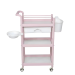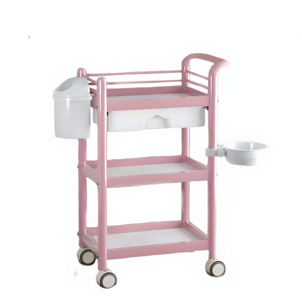 El Carrito Auxiliar Mía Pink es perfecto para espacios que requieren orden y funcionalidad especializada. Cuenta con estructura metálica rosa, bandejas blancas resistentes y accesorios integrados como bandeja deslizable, recipiente lateral y bowl desmontable. Ideal para salones, centros estéticos y clínicas.