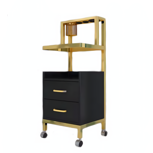 El Carrito Auxiliar Negro con Dorado modelo Aria es sinónimo de lujo funcional. Diseñado para salones de alto nivel, su estructura metálica dorada resalta elegancia, mientras sus cajones negros aportan sobriedad y orden en cada jornada profesional.
