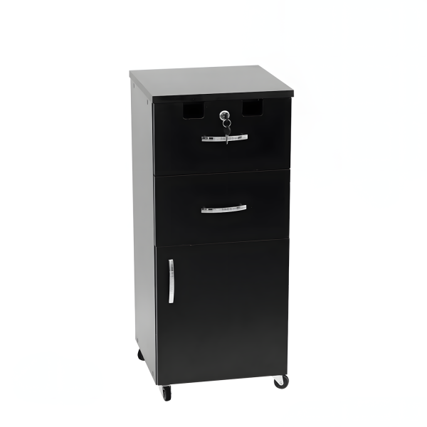 El Auxiliar Profesional Amy es una solución elegante y segura para profesionales que necesitan organización y eficiencia. Su acabado en melamina negra y jaladores cromados le dan un estilo moderno y sofisticado, ideal para barberías y salones.
