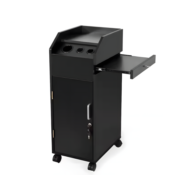 El Ayudante Profesional Iva está diseñado para brindar organización total en barberías, salones y centros estéticos. Fabricado en melamina blanca de alta resistencia, cuenta con bandejas internas deslizables, compartimientos superiores con orificios para herramientas y una mesa lateral retráctil que optimiza el espacio de trabajo.