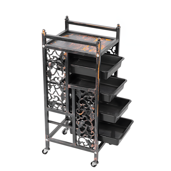 Descubre el Carrito Auxiliar Edna, una fusión de estilo clásico y funcionalidad moderna que realza cualquier espacio profesional. Su estructura metálica con acabados decorativos estilo forja aporta elegancia artesanal y distinción a tu salón o barbería.