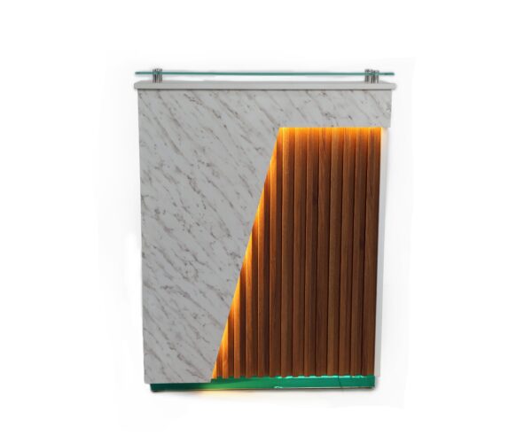 Tu recepción es el primer contacto con los clientes, y este módulo de recepción está diseñado para transmitir confianza, calidez y profesionalismo desde el primer instante. Su estructura en blanco marmoleado refleja pureza y modernidad, mientras que el frente en madera nogal con diseño vertical aporta un toque natural y acogedor que conecta emocionalmente con tus visitantes.