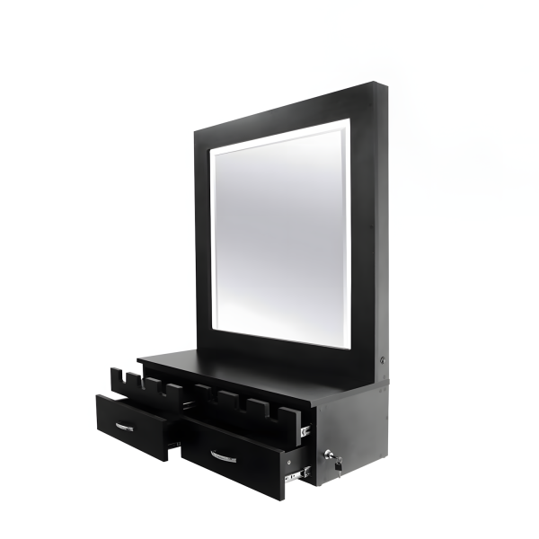 La Estación con Espejo LED Asher fusiona modernidad y practicidad en un solo módulo. Diseñada para brindar iluminación óptima y facilitar el trabajo profesional, su estética robusta con detalles contemporáneos la convierten en un complemento clave para salones exigentes.