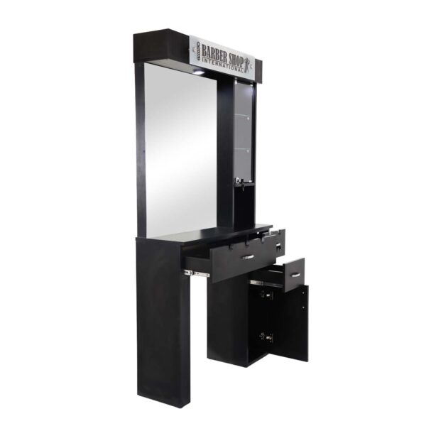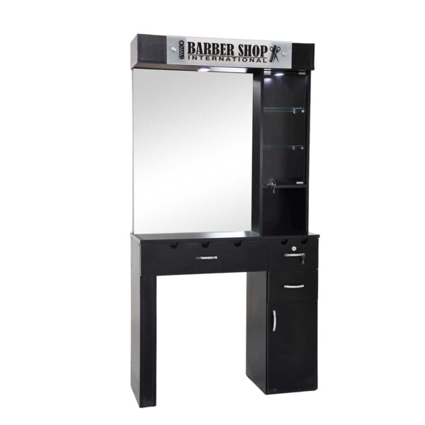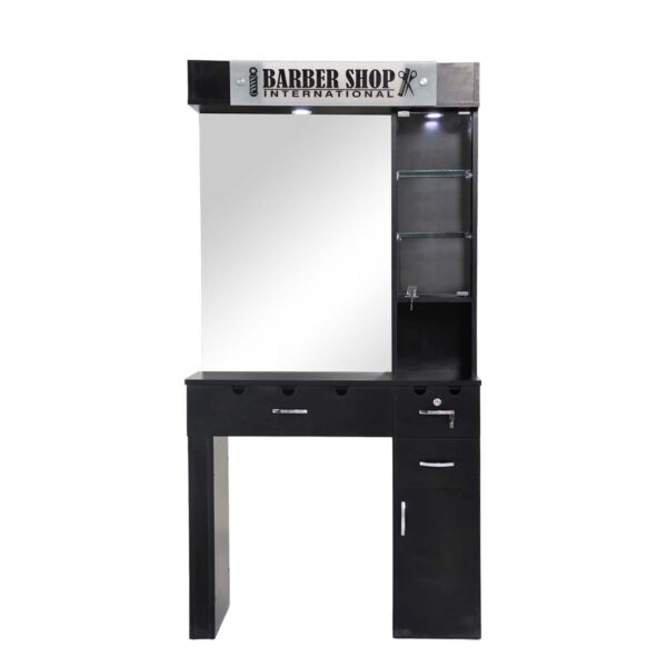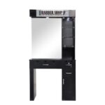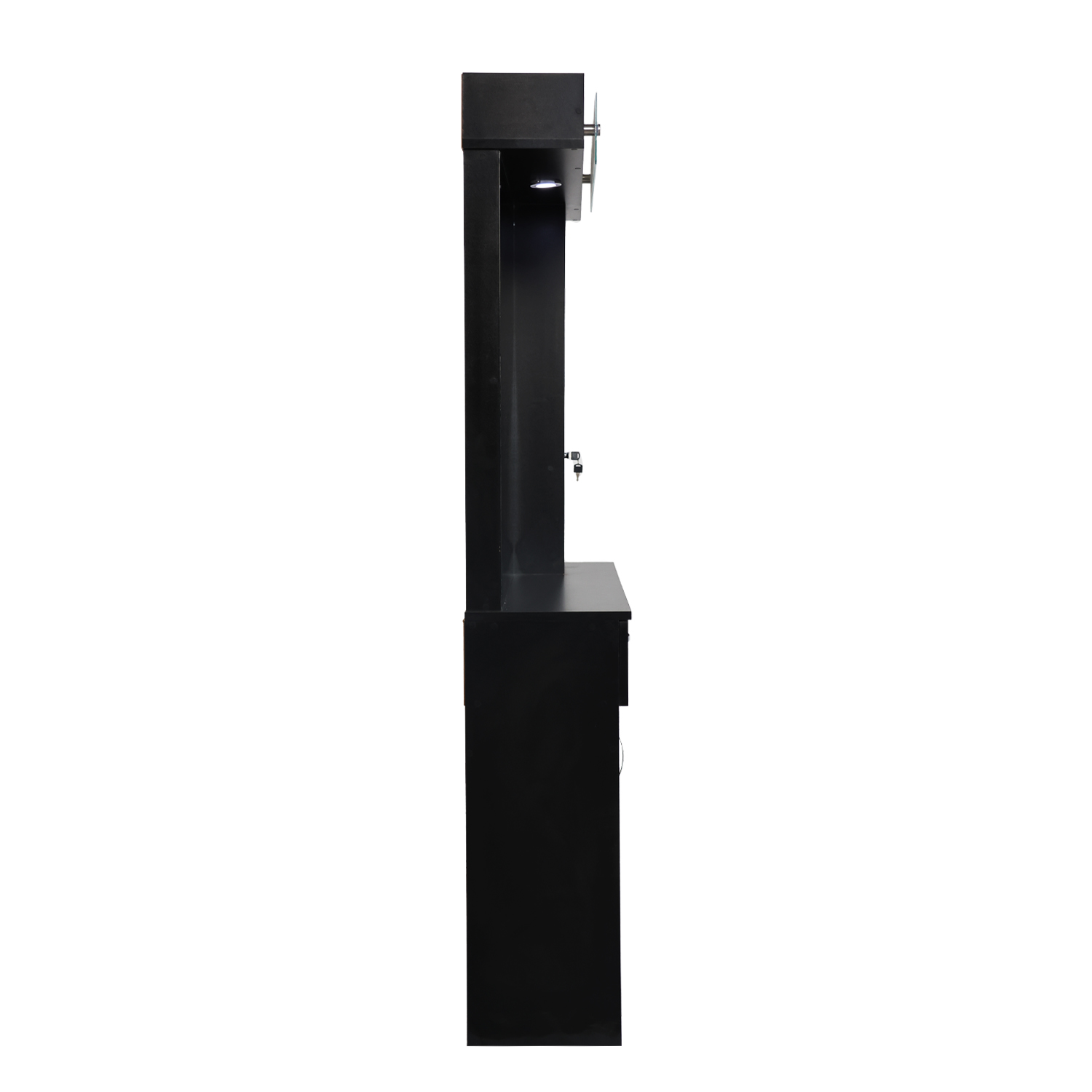 La Estación con Espejo Pro Ravel combina look sobrio en negro con organización total. La vitrina lateral con llave resguarda tus insumos, mientras los cajones y el mueble inferior mantienen todo a la mano. El LED superior brinda una iluminación limpia para cortes, peinados y maquillaje.