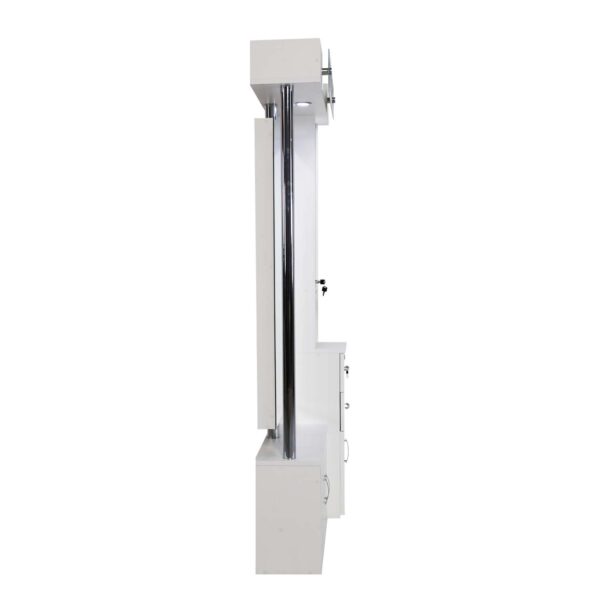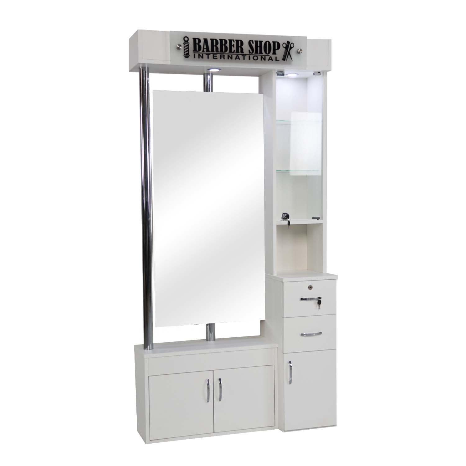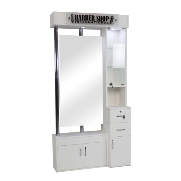 La Estación con Espejo Axton combina presencia moderna y funcionalidad para un flujo de trabajo ágil. La vitrina lateral con cerradura protege insumos, mientras los cajones y el mueble inferior mantienen todo organizado. El LED superior realza el rostro para cortes y estilizados con precisión.