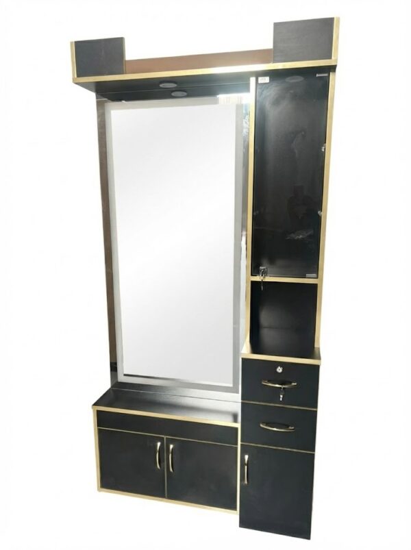 El Tocador Profesional con Espejo aporta elegancia y funcionalidad a cualquier salón. Su diseño en negro con bordes dorados ofrece un aspecto moderno, mientras sus múltiples compartimentos permiten mantener herramientas y productos siempre organizados. Incluye cajón con llave para resguardar objetos de valor y un amplio espejo central para servicios de belleza, barbería o maquillaje.