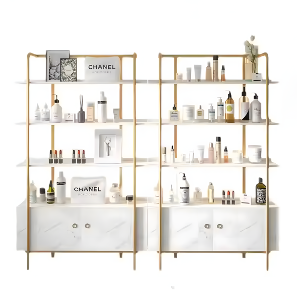 El Exhibidor Personalizado Alba ha sido diseñado para aportar una presencia elegante y poderosa a cualquier espacio. Su estructura metálica dorada y repisas tipo mármol blanco combinan lujo clásico con modernidad. Ideal para salones que desean destacar estética y orden.