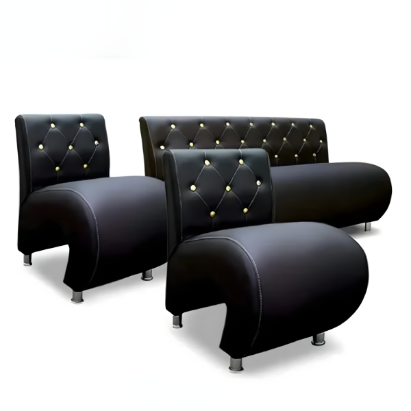 El juego Sillón de Espera Elie es sinónimo de distinción, elegancia moderna y comodidad premium. Su estructura sofisticada con curvas suaves y botones dorados lo convierte en el centro visual de cualquier recepción, proyectando una imagen de alto nivel para barberías o salones que buscan impresionar desde el primer momento.