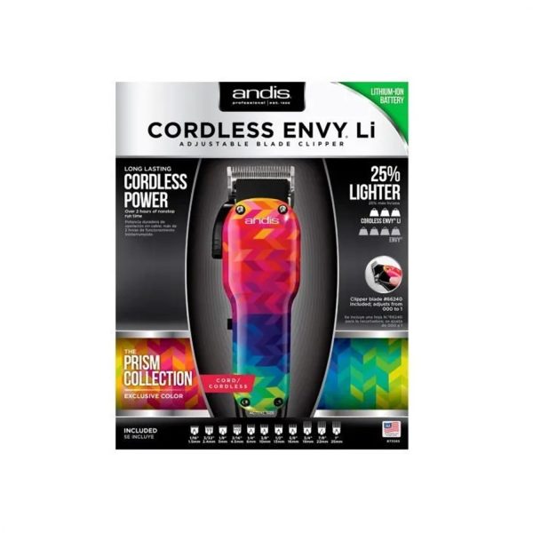 La Maquina Clipper Envy Li Prisma deslumbra con su diseño multicolor y desempeño profesional. Diseñada para barberos que buscan estilo impactante sin sacrificar funcionalidad ni resultados precisos.