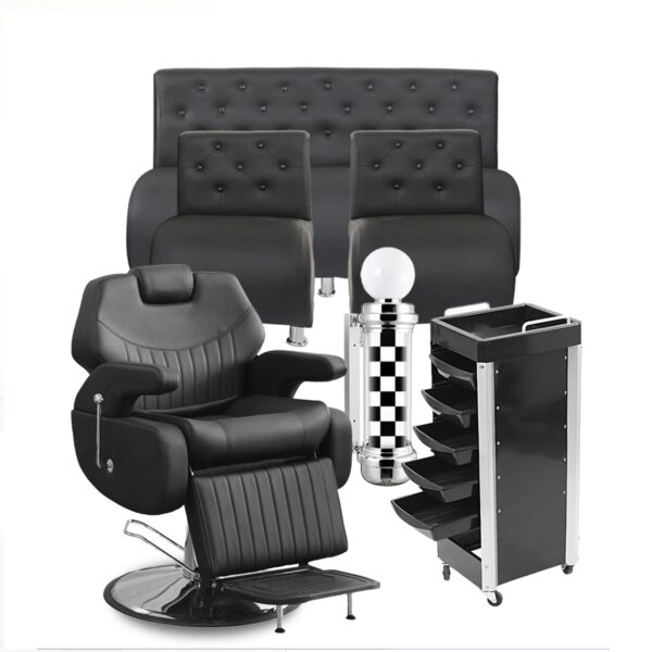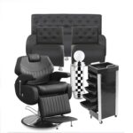 «Impresiona a tus clientes desde el primer momento con un mobiliario que refleja lujo, confort y profesionalismo. Este Pack Master incluye sillón de barbería vintage, módulo con espejo, sofá de espera y pole barbero, todo en un elegante acabado negro que transmite confianza y estilo. Diseñado para que tu barbería no solo luzca increíble, sino que se convierta en la favorita de tus clientes.»