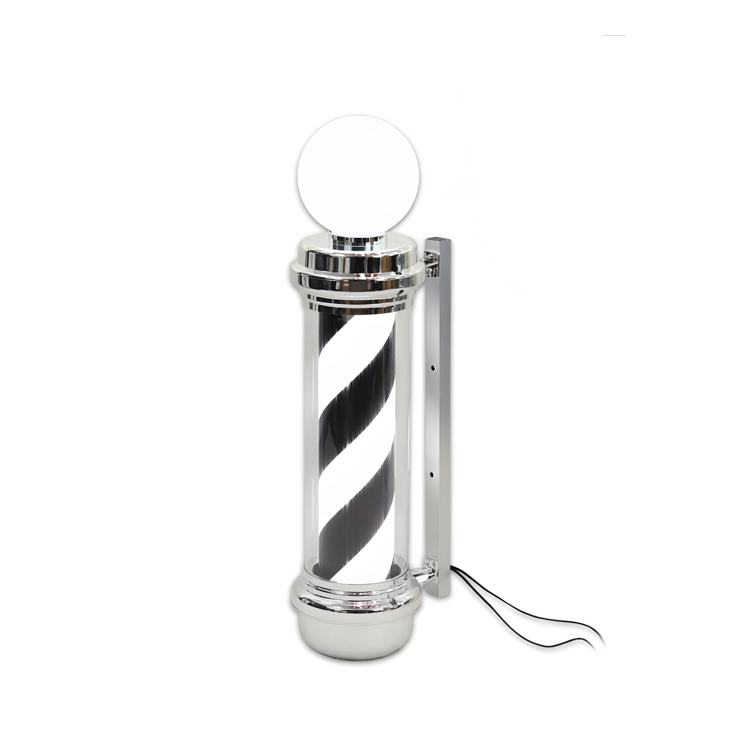 Descubre el Pole Barber Ion, una reinterpretación minimalista del tradicional símbolo barbero. Su cilindro giratorio en blanco y negro crea un efecto visual sofisticado y moderno, ideal para barberías que apuestan por un estilo más sobrio y contemporáneo. Su acabado cromado brillante y esfera superior luminosa completan una pieza de alto impacto visual.