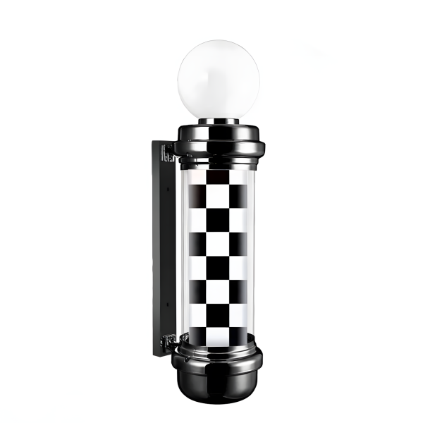 Descubre el Pole Barber Boris, un farol de barbería que reinventa lo clásico con un patrón checker en blanco y negro que impone actitud desde la entrada. Su cilindro giratorio crea un efecto visual en movimiento, mientras que su estructura cromada y esfera superior luminosa le dan un toque moderno y profesional.