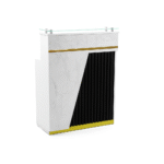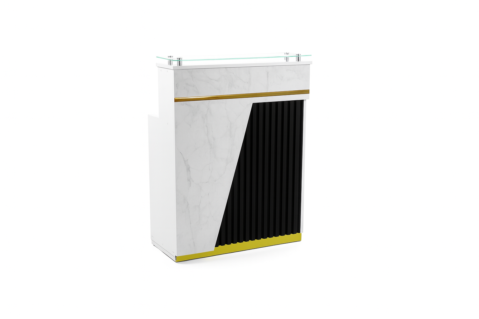La recepción es el corazón de tu negocio, el primer punto donde tus clientes deciden si regresarán. Este counter de diseño moderno combina la pureza del blanco marmoleado, que transmite orden y limpieza, con la fuerza del negro profundo, reflejando carácter y profesionalismo. Los detalles dorados añaden un aire de distinción y exclusividad, proyectando la imagen de un salón, spa o barbería de alto nivel.