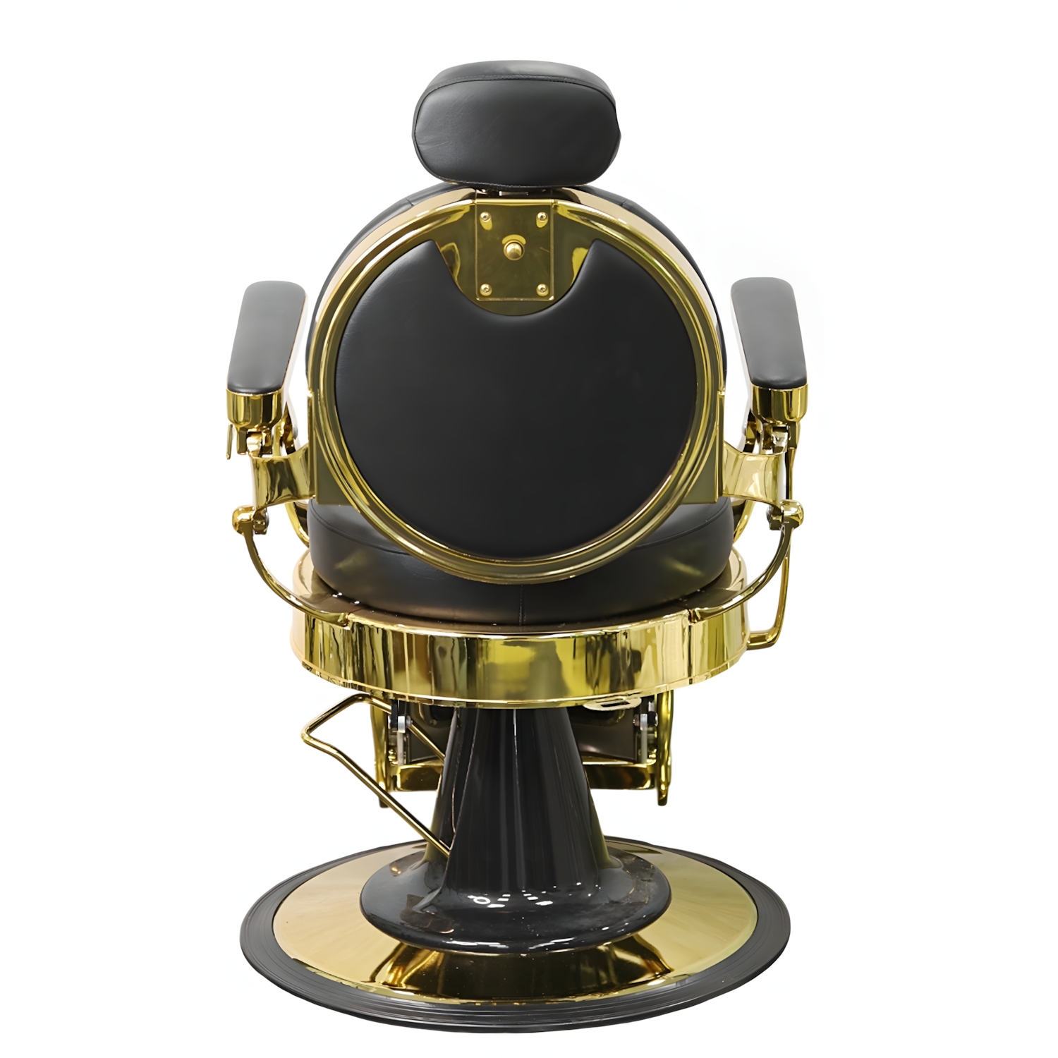 El Sillón Barbero Orus destaca por su diseño lujoso y estructura imponente. Su acabado dorado espejo, detalles cincelados y tapizado negro capitoné lo convierten en una pieza central para barberías que apuestan por lo extraordinario.