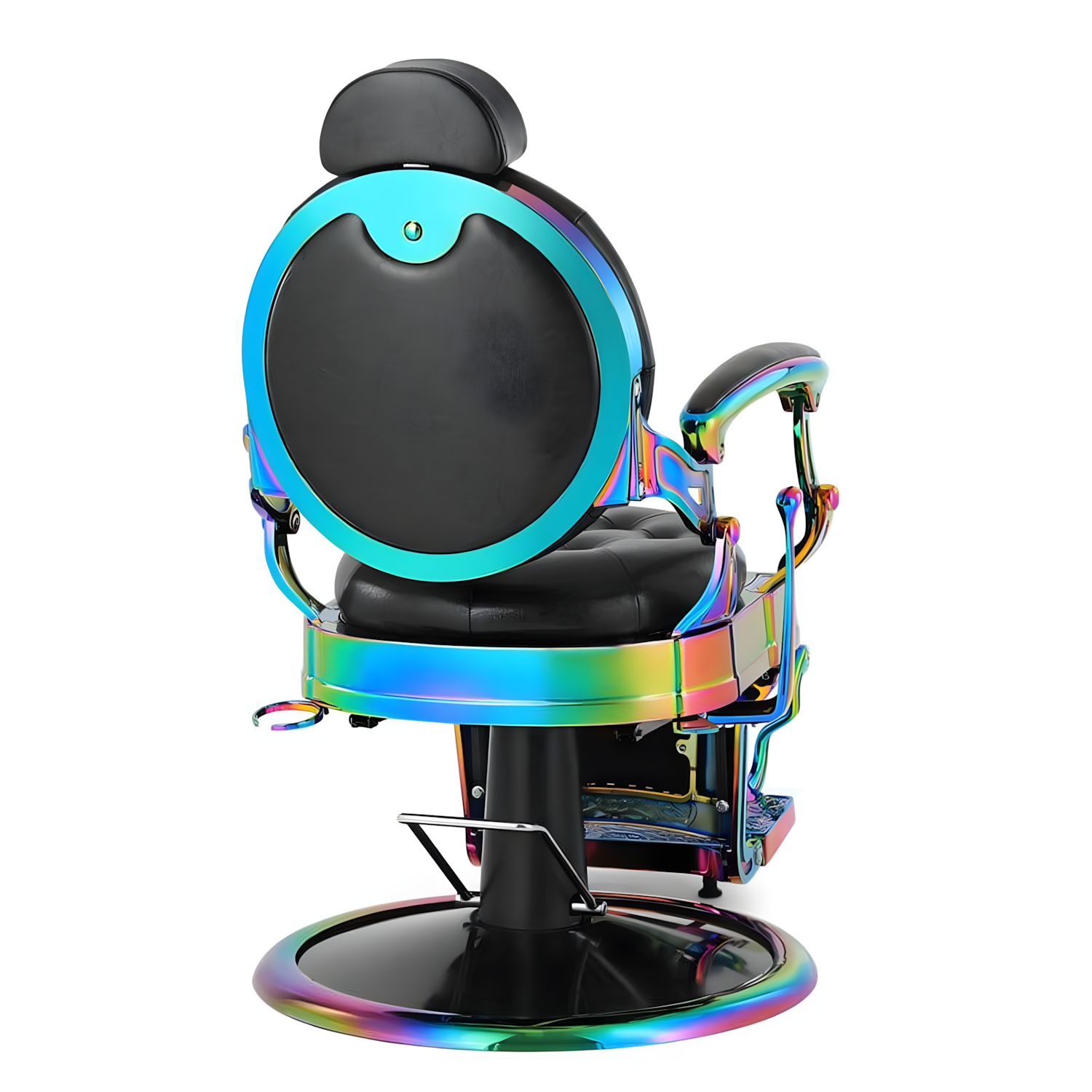 El Sillón Barbero Trico rompe esquemas con su impactante acabado cromado multicolor. Su estructura metálica iridiscente y tapizado capitoné lo convierten en la opción perfecta para barberías que buscan diferenciarse con estilo futurista y personalidad única.
