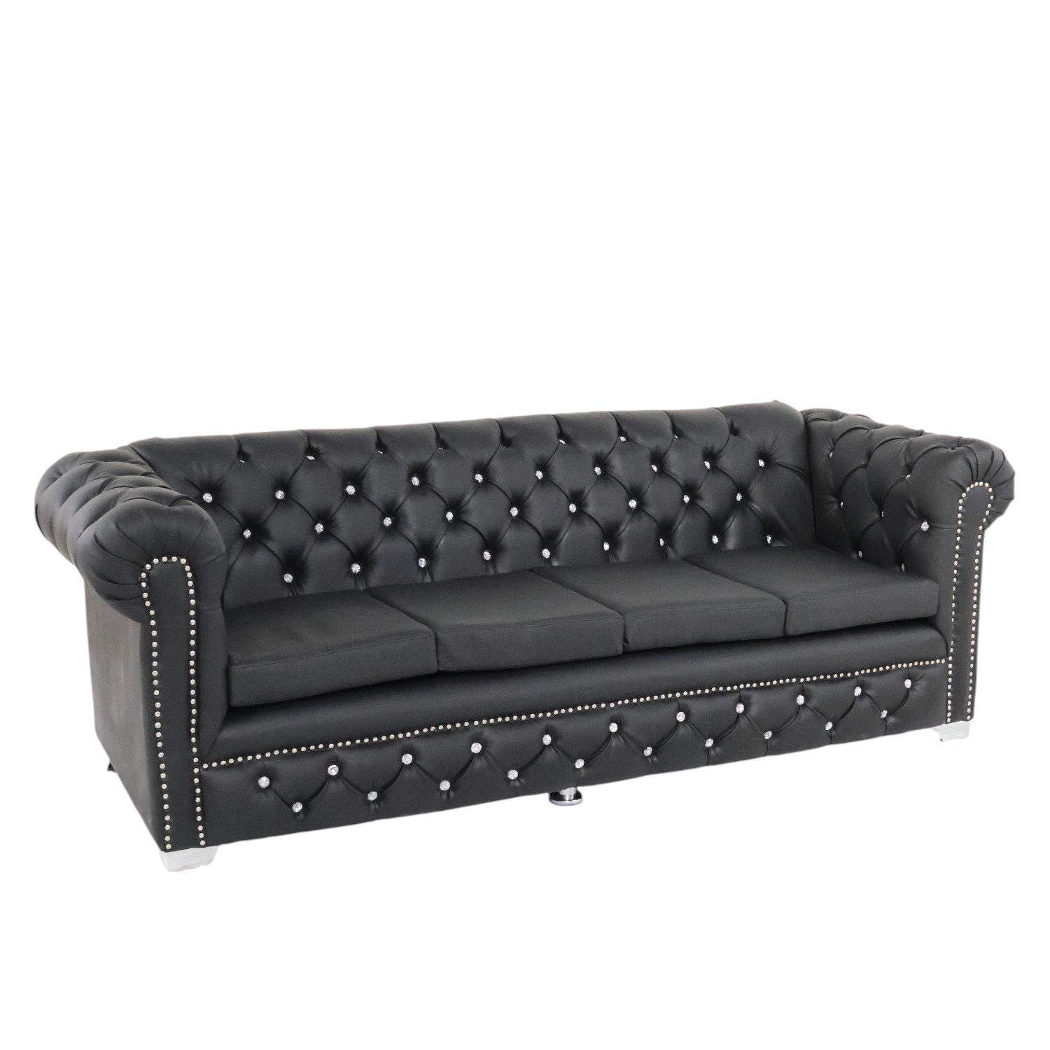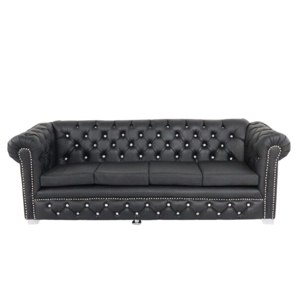 ◽ Diseño Chesterfield Tradicional: Costuras profundas tipo capitoné, brazos curvos y remaches decorativos que realzan el carácter del mueble.