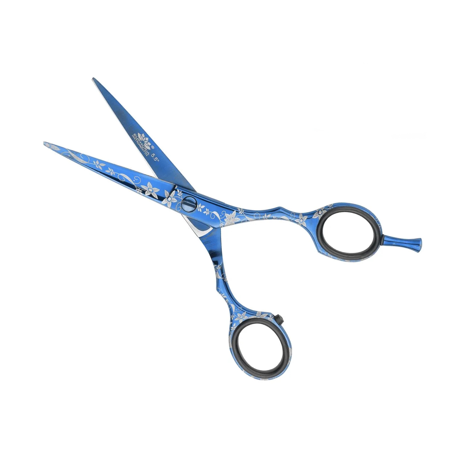 La Tijera Azul Floral Euphoria 5.5” fusiona delicadeza estética con alta precisión. Su diseño con grabados florales sobre acero titanizado azul es tan funcional como atractivo, ideal para estilistas que cuidan cada detalle.