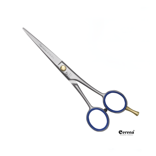 La Cerena Superieur 5.5″ es una tijera profesional fabricada en Solingen, Alemania, diseñada para brindar un corte suave y controlado gracias a su filo dulce de alta precisión. Su diseño tradicional con detalles en azul transmite profesionalismo y sobriedad.